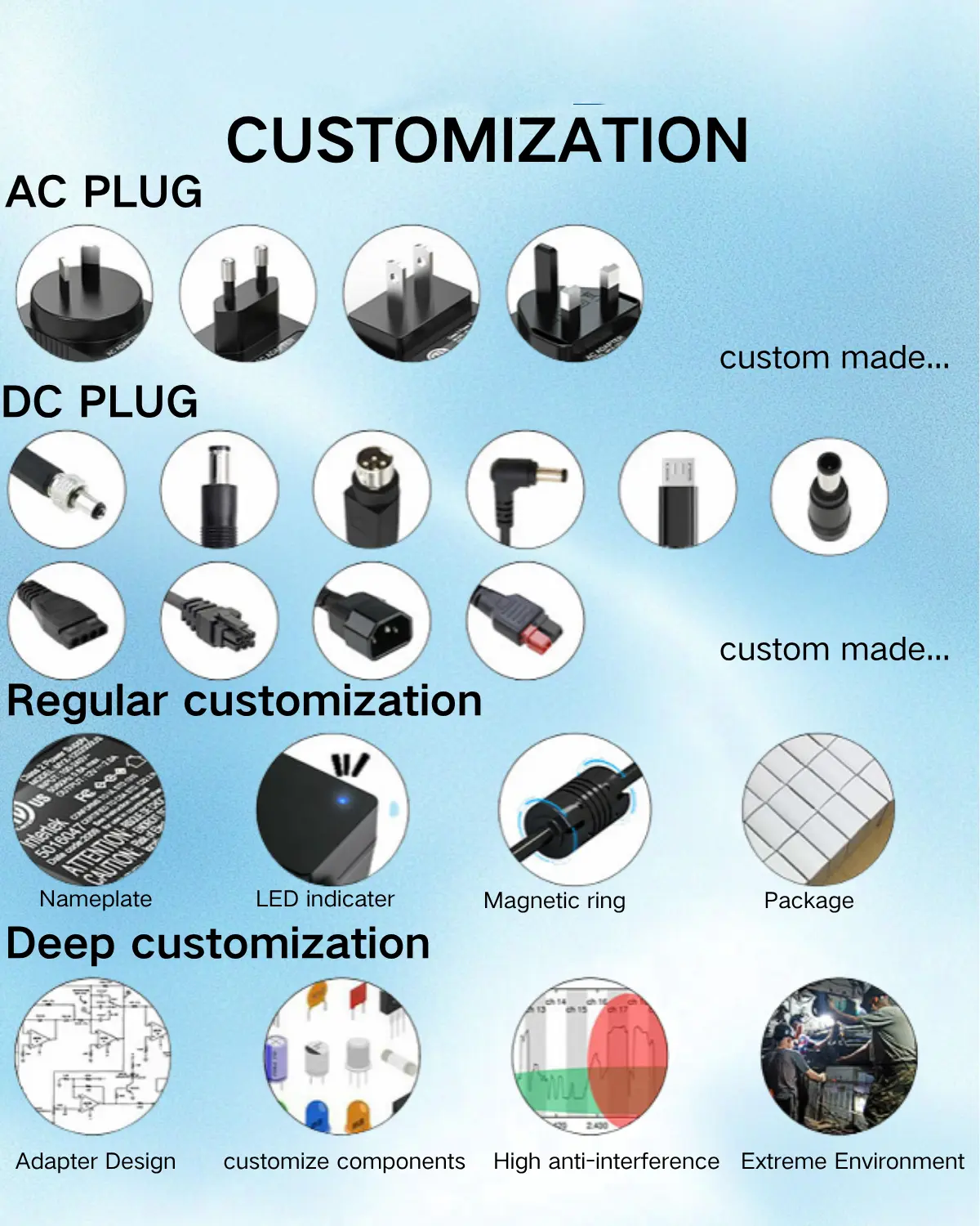 Jsme továrna na napájení AC/DC, která dokáže přizpůsobit jakýkoli napájecí adaptér a projít příslušnými certifikacemi.