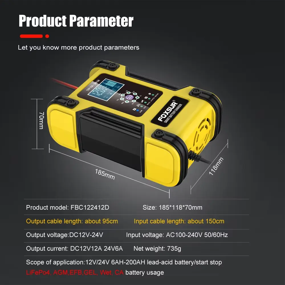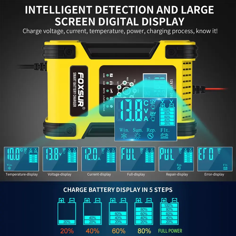 12V 24V 12A 7segmentová inteligentní nabíječka olověných baterií od společnosti Starwell je navržena tak, aby splňovala vysoké požadavky na nabíjení olověných baterií. Jako přední výrobce a dodavatel z Číny se Starwell specializuje na poskytování vysoce kvalitních nabíječek, které poskytují vynikající výkon a spolehlivost. Tato nabíječka je vybavena nejmodernějšími funkcemi, které z ní dělají ideální volbu pro automobilové, průmyslové a rekreační aplikace.