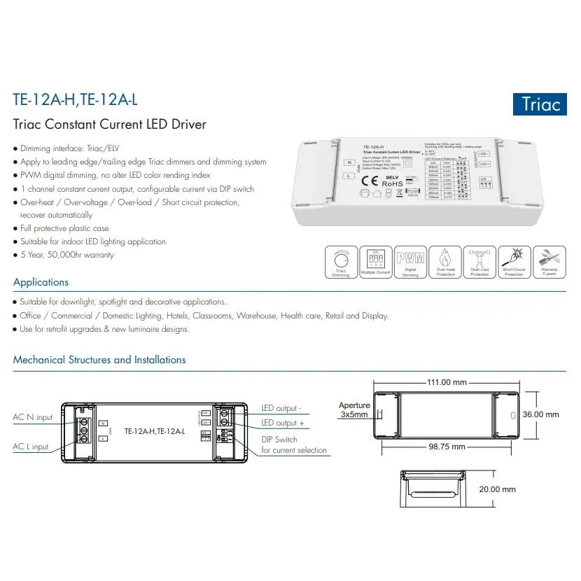 Starwell vysoce kvalitní 12W triakový stmívací LED driver s konstantním proudem integruje funkce ochrany proti přepětí, nadproudu a zkratu a vyznačuje se vysokým účiníkem a nízkým harmonickým zkreslením, čímž splňuje řadu mezinárodních norem energetické účinnosti a bezpečnosti. Jeho kompaktní design usnadňuje instalaci a je vhodný pro různé scénáře vnitřního osvětlení, jako jsou stropní svítidla, bodová světla a dekorativní světla, což z něj činí ideální řešení ovladače pro energeticky úsporné renovace a aplikace inteligentního osvětlení. ProduktVlastnosti: