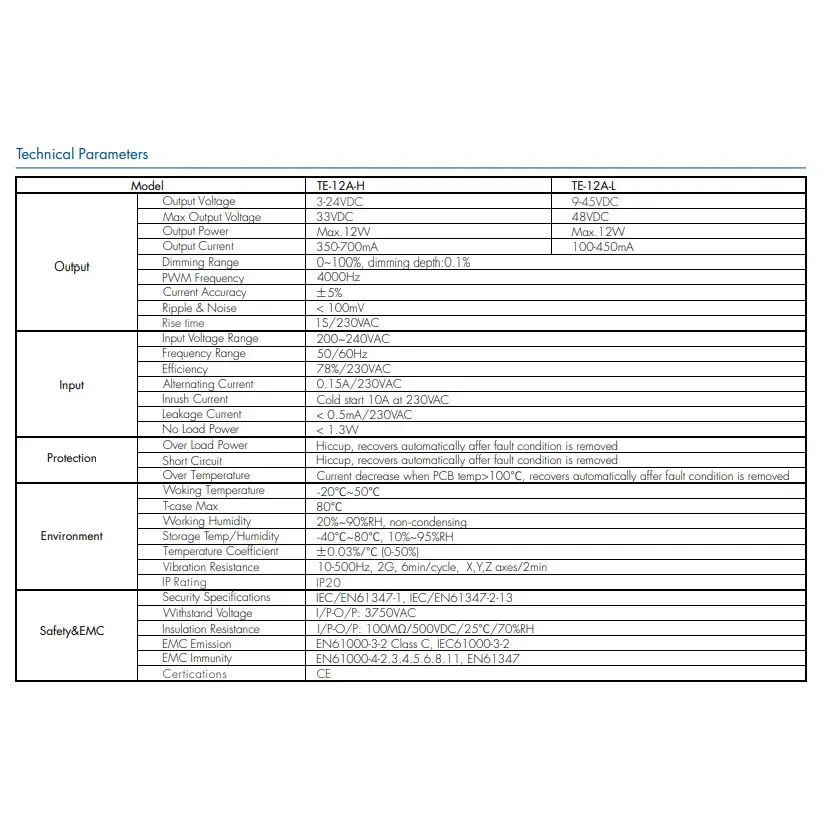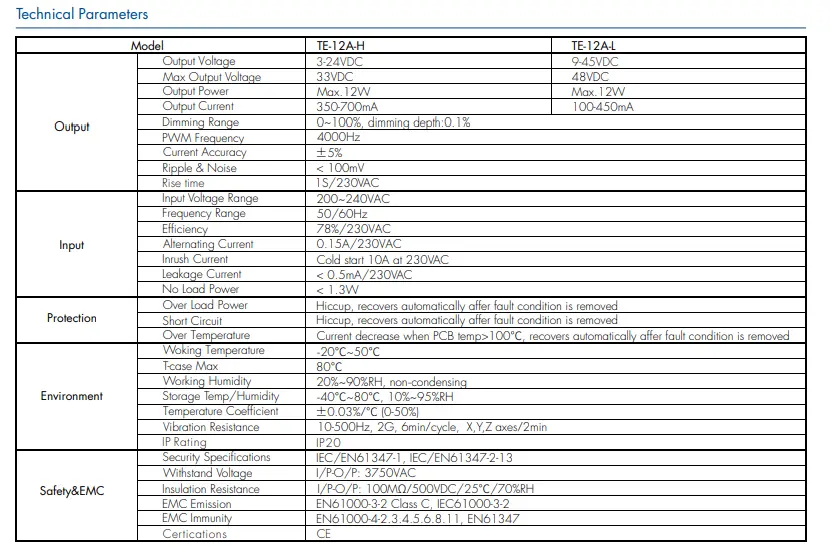 Vstupní napětí: 200-240VAC 50-60Hz Vstupní proud: 0,15A Výstupní výkon: 12 wattů Max Výstupní napětí: 9~42V Záruka: 2 roky Certifikát: CE/Rohs