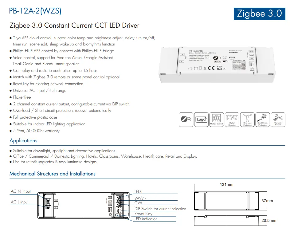12W TUYA Zigbee CCT stmívatelné LED ovladače se vyznačují vysokou účinností konverze až 85 %, účiníkem ≥0,90 a nízkou spotřebou energie bez zátěže, čímž účinně snižují plýtvání energií. Vestavěné plné ochrany včetně přepětí, nadproudu, zkratu a přehřátí zajišťují bezpečný a stabilní provoz. Díky kompaktnímu a ohni odolnému krytu je široce používán v inteligentních domácnostech, hotelech, kancelářích a maloobchodních systémech laditelného bílého osvětlení, které poskytují spolehlivý a uživatelsky přívětivý výkon inteligentního stmívání.