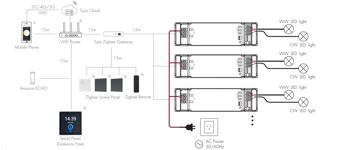 Ovladač TUYA Zigbee LED plně podporuje protokol TUYA Zigbee pro stabilní bezdrátové připojení, dosažení hladkého CCT bez blikání a ztlumení jasu. Podporuje ovládání APP, hlasové ovládání, skupinové ovládání a scénický režim, což přináší velké pohodlí pro chytré osvětlovací systémy.