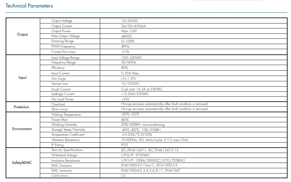 S univerzálním vstupem 100~240VAC se CCT Dimmable LED Driver přizpůsobí globálním rozvodným sítím. Vysoká účinnost až 85 % a účiník ≥0,90 nižší spotřeba energie a tvorba tepla, což prodlužuje životnost budiče i LED.
