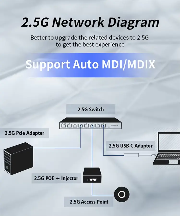 Kompatibilita napájení: Kompatibilní se zařízeními IEEE802.3af (15,4W), IEEE802.3at (30W) a dokonce i IEEE802.3bt (90W) / PoE++ (60W).