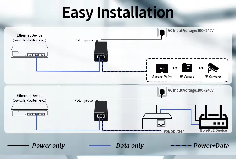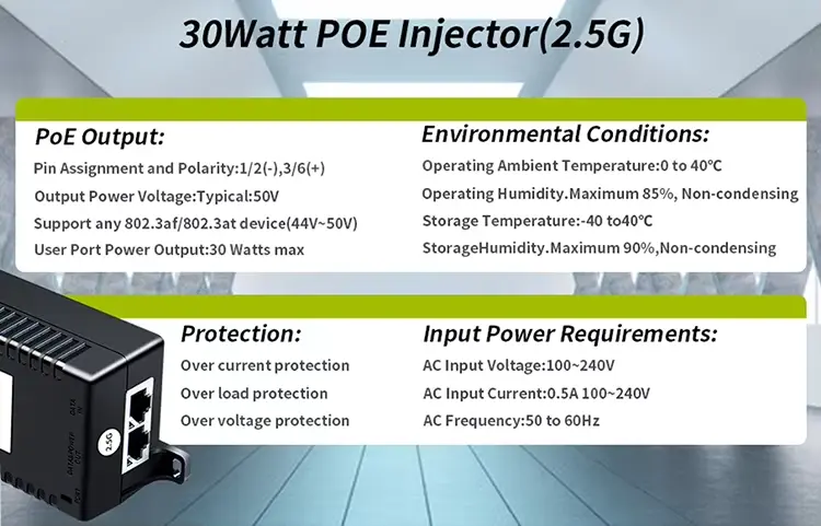 Tento 30W Poe Injektor podporuje více standardů PoE, díky čemuž je flexibilní volbou pro různá zařízení.