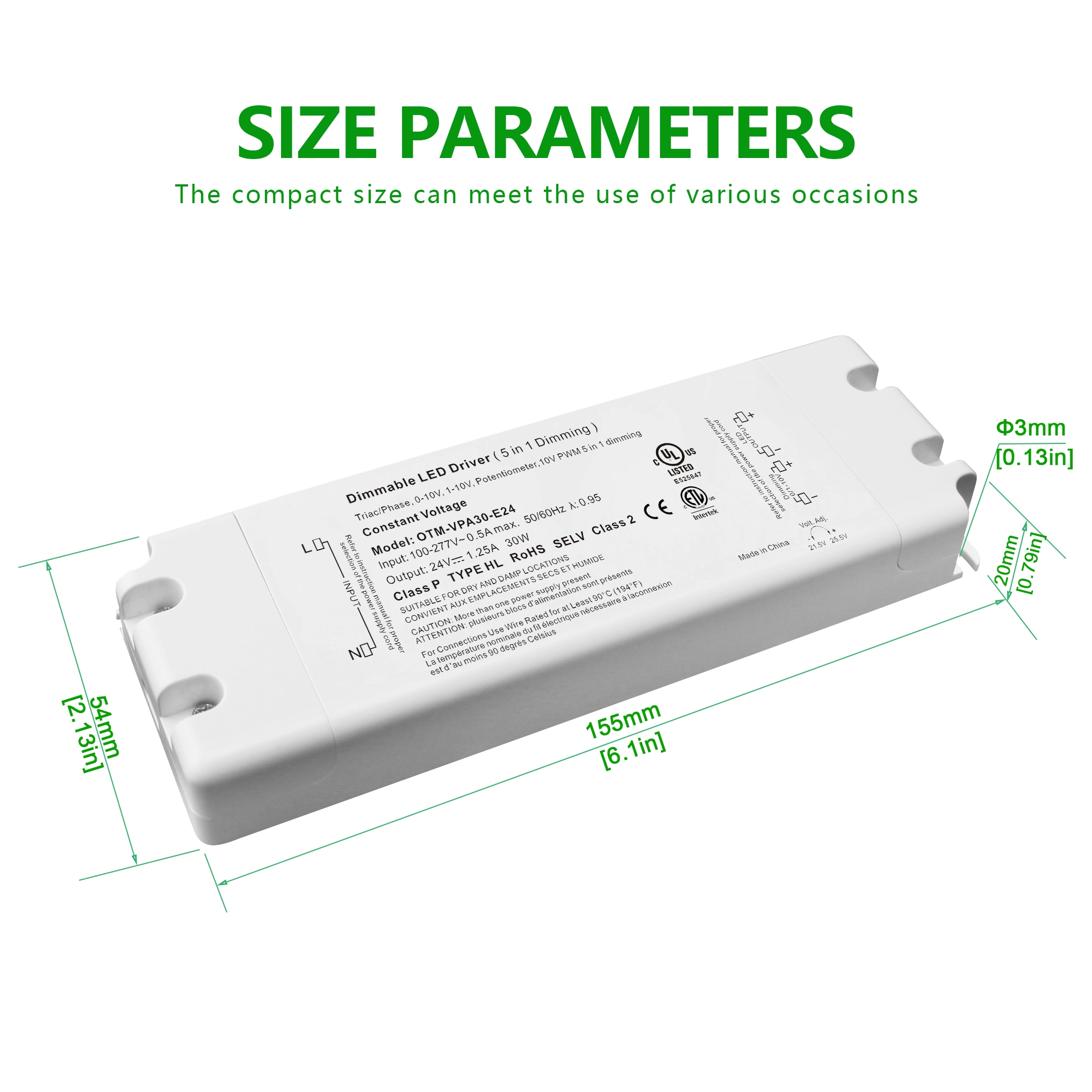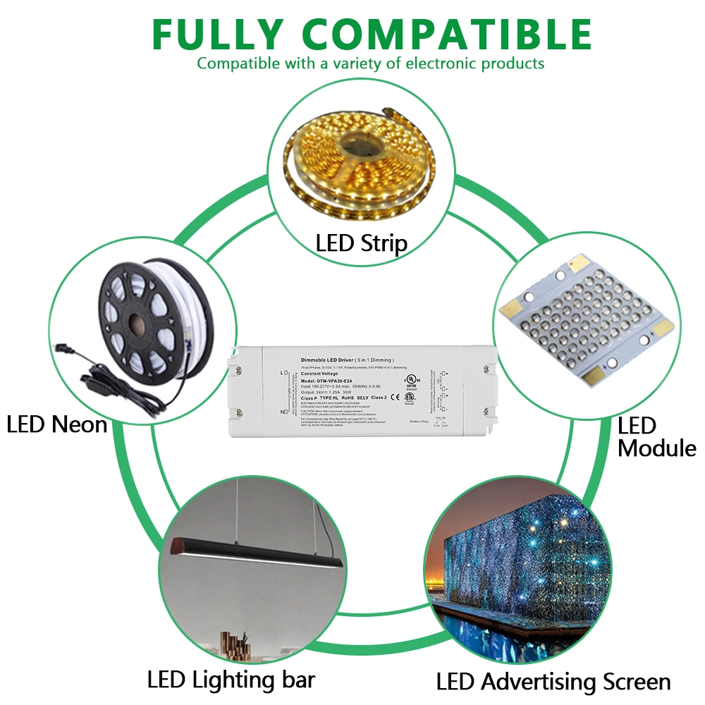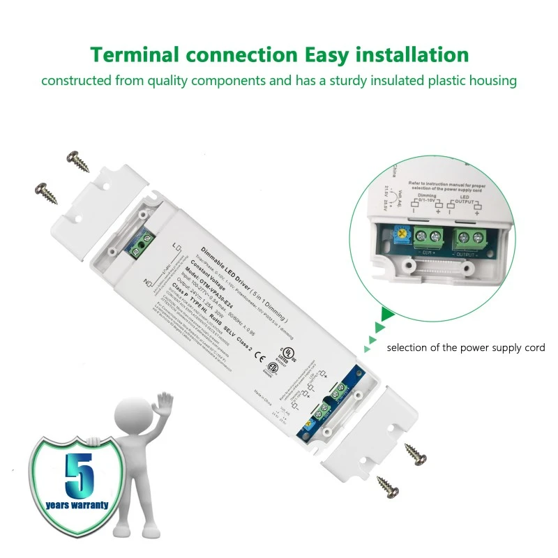 Elegantní 24V 30W 0-10V stmívací LED ovladač s konstantním napětím od výrobce STARWELL dokáže dodat maximální výstupní výkon až 30W a je speciálně navržen pro dosažení bezproblémového ovládání stmívání od 0 do 10V. Vyznačuje se stabilním napěťovým výstupem s koeficientem zvlnění ≤ 120 mVp-p, který zajišťuje výkon LED svítidel bez blikání. Jeho rozsah vstupního napětí je široký (100-240V AC, 50/60Hz), s účinností konverze až 88 %, což umožňuje energeticky úsporný provoz. Vyhovuje také globálním normám napětí. Tento 0-10V LED ovladač je vybaven různými ochrannými funkcemi, které zajišťují spolehlivé a bezpečné použití v různých aplikacích vnitřního a venkovního osvětlení.