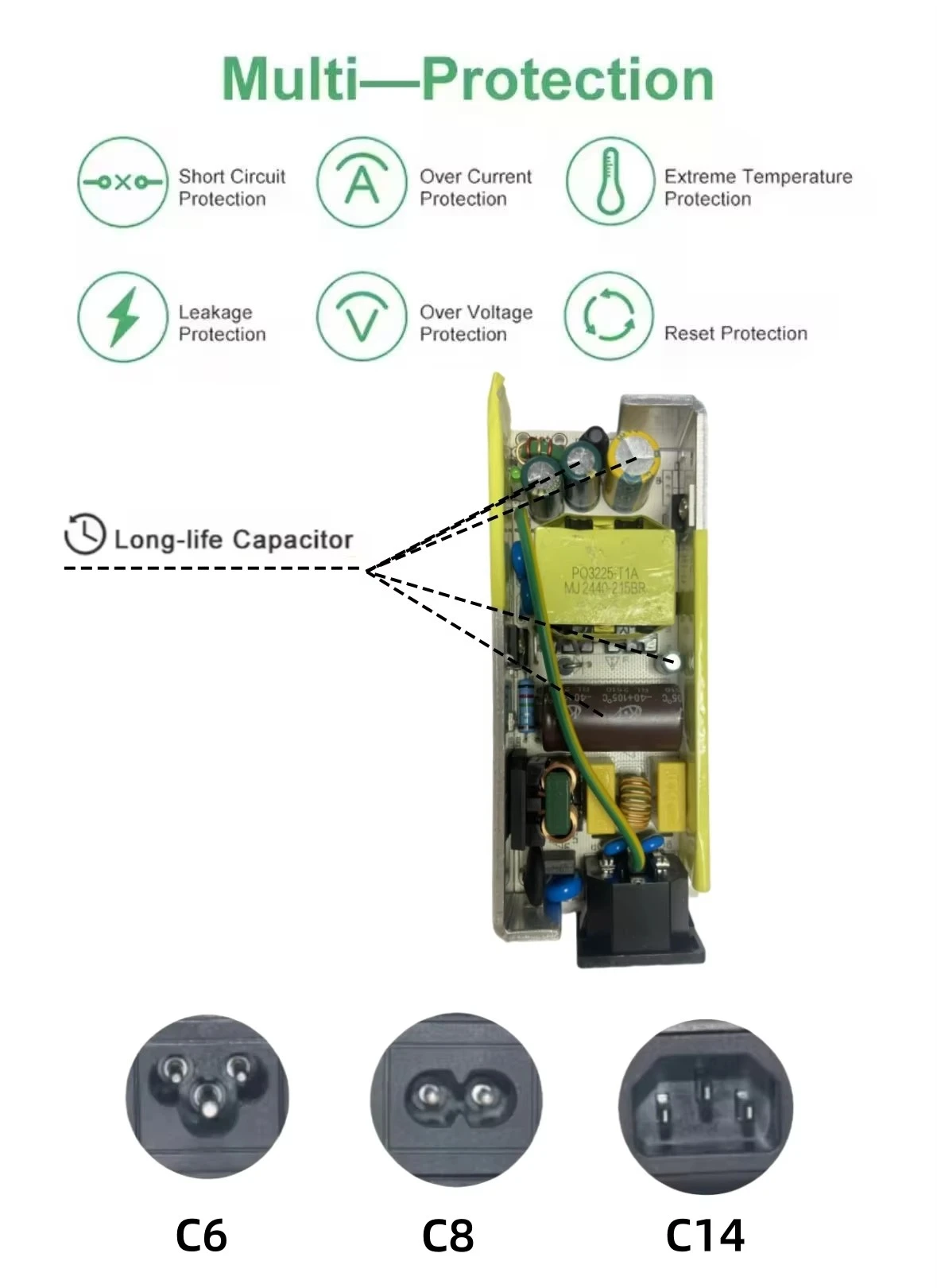Komplexní bezpečnostní ochrany: Integrované ochrany včetně ochrany proti přepětí (OCP), ochrany proti přepětí (OVP) a ochrany proti zkratu (SCP) zabraňují poškození adaptéru i vašeho cenného vybavení.