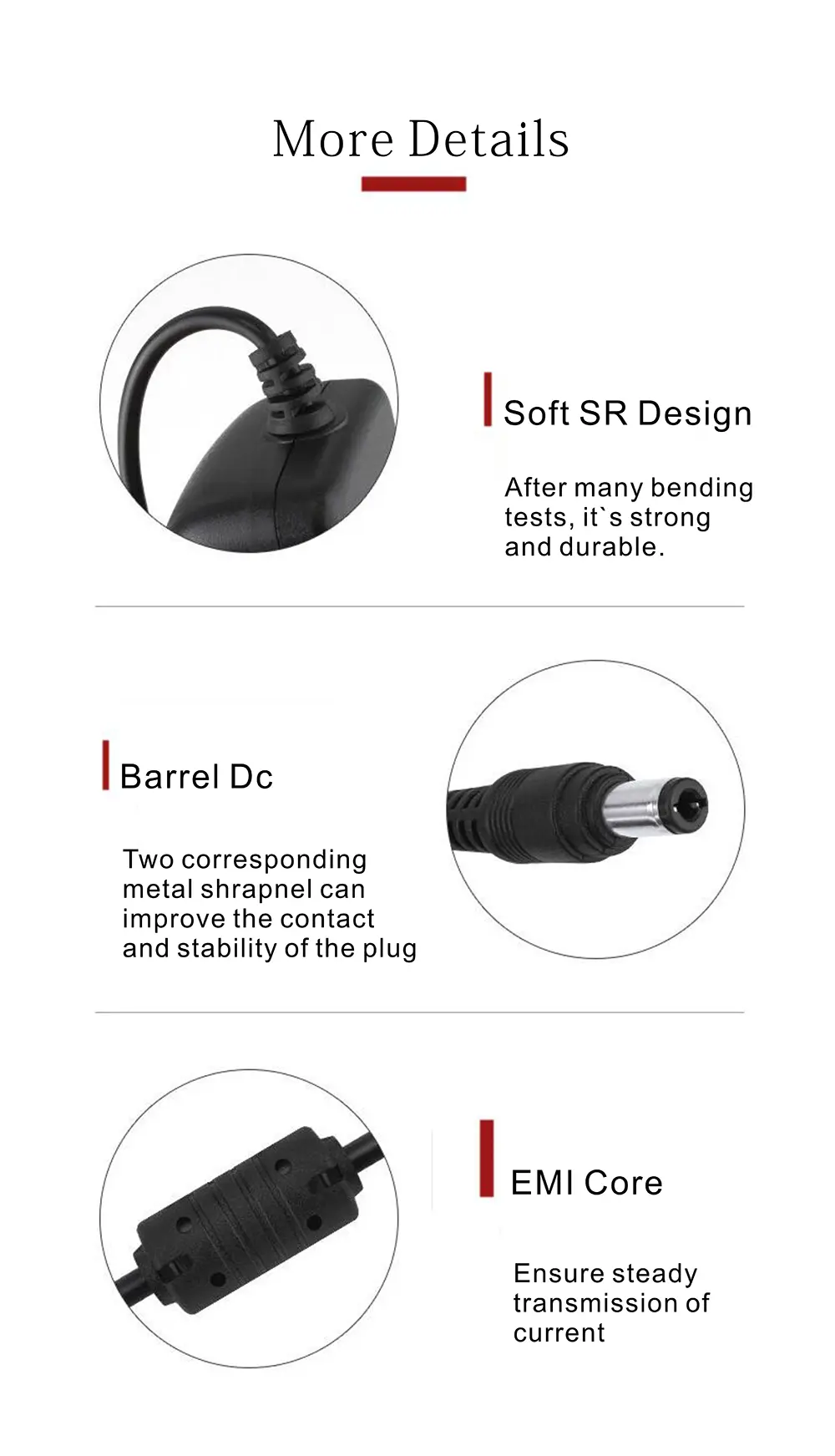 3. Přizpůsobit konektor: Ujistěte se, že velikost zástrčky (např. 5,5 mm x 2,1 mm) a polarita (často kladná na střed) odpovídají stejnosměrnému konektoru vašeho zařízení. Neshoda může způsobit poškození.