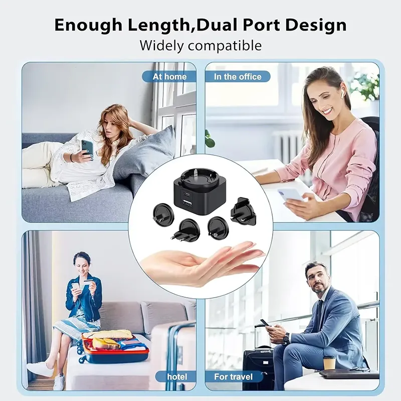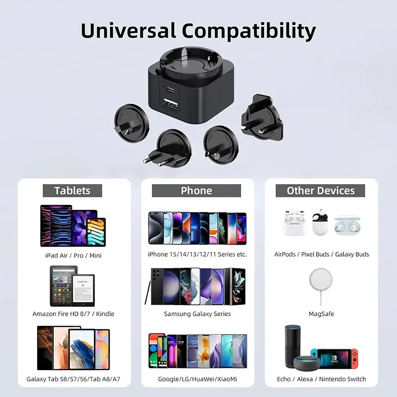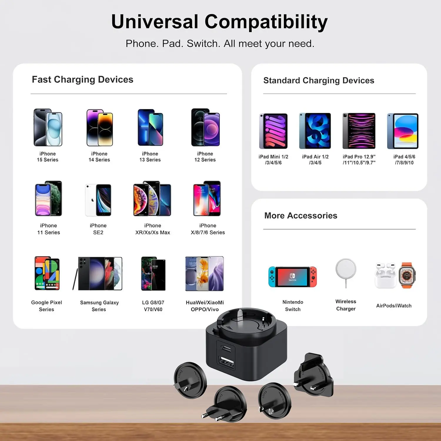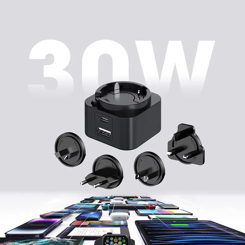 Všestrannost je klíčová. Konstrukce se dvěma porty (USB-C/USB-A) umožňuje nabíjet dvě zařízení současně. 30W výměnná zástrčka PD Charger obsahuje sadu výměnných zástrček (US/EU/UK/AU), díky čemuž je vaším dokonalým společníkem na cesty po celém světě. Ať už nabíjíte smartphone, tablet nebo notebook, univerzální kompatibilita zajišťuje špičkový výkon.