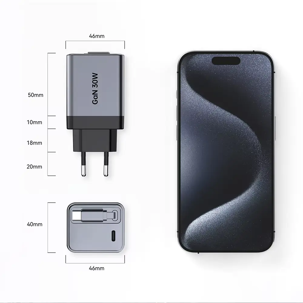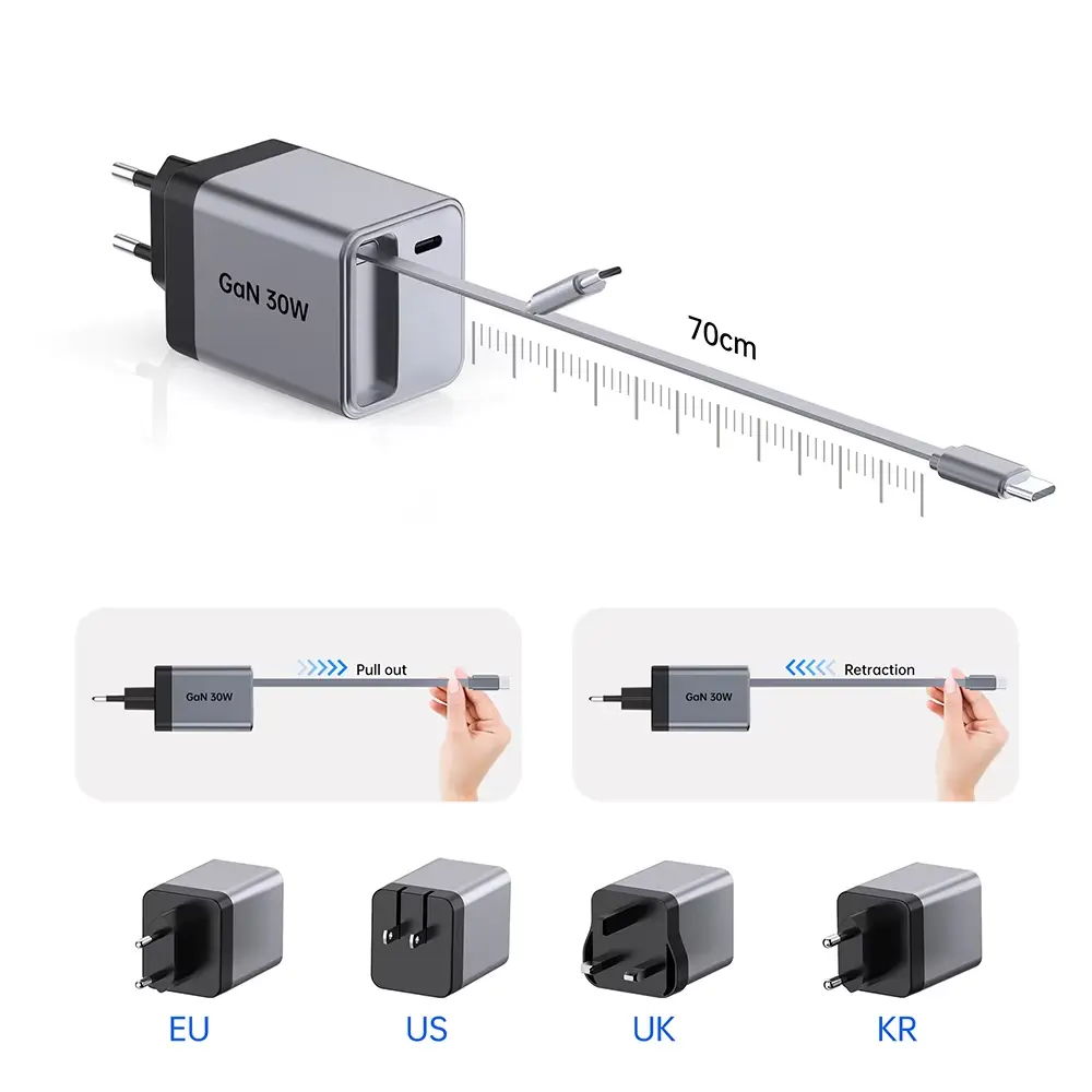 30W rychlonabíječka se zasouvacím kabelem typu C Ultra lehký design kapesní velikosti usnadňuje přenášení. Je to ideální volba pro domácnost, kancelář nebo cestování.