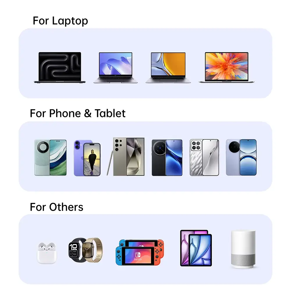 Kompatibilní se zařízeními USB-C, včetně mobilních telefonů, sluchátek a herního příslušenství. Automaticky detekuje potřeby zařízení pro bezpečné a efektivní nabíjení. 4. Přenositelnost připravená na cesty