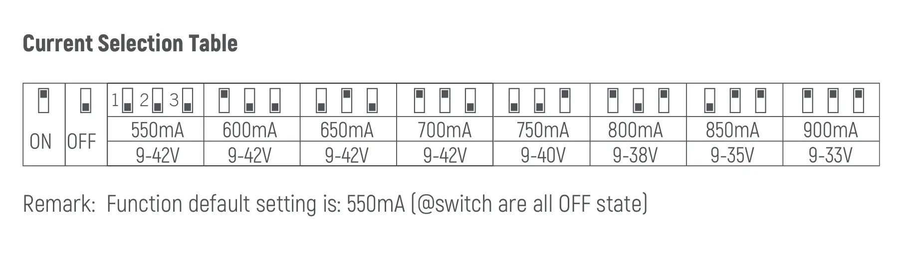 Výstupní proud: nastavitelný, podrobnosti viz tabulka výběru proudu