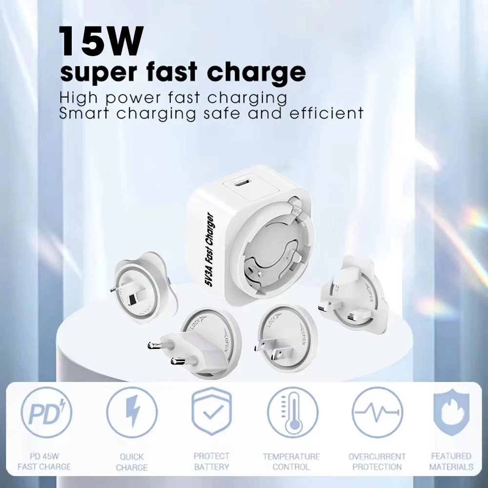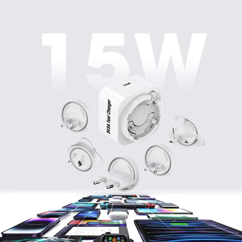 Kompletní sada odnímatelných zástrček (US/EU/UK/AU/KR/CN) zajišťuje bezproblémové použití ve více než 150 zemích – ideální pro mezinárodní cestování a každodenní použití.