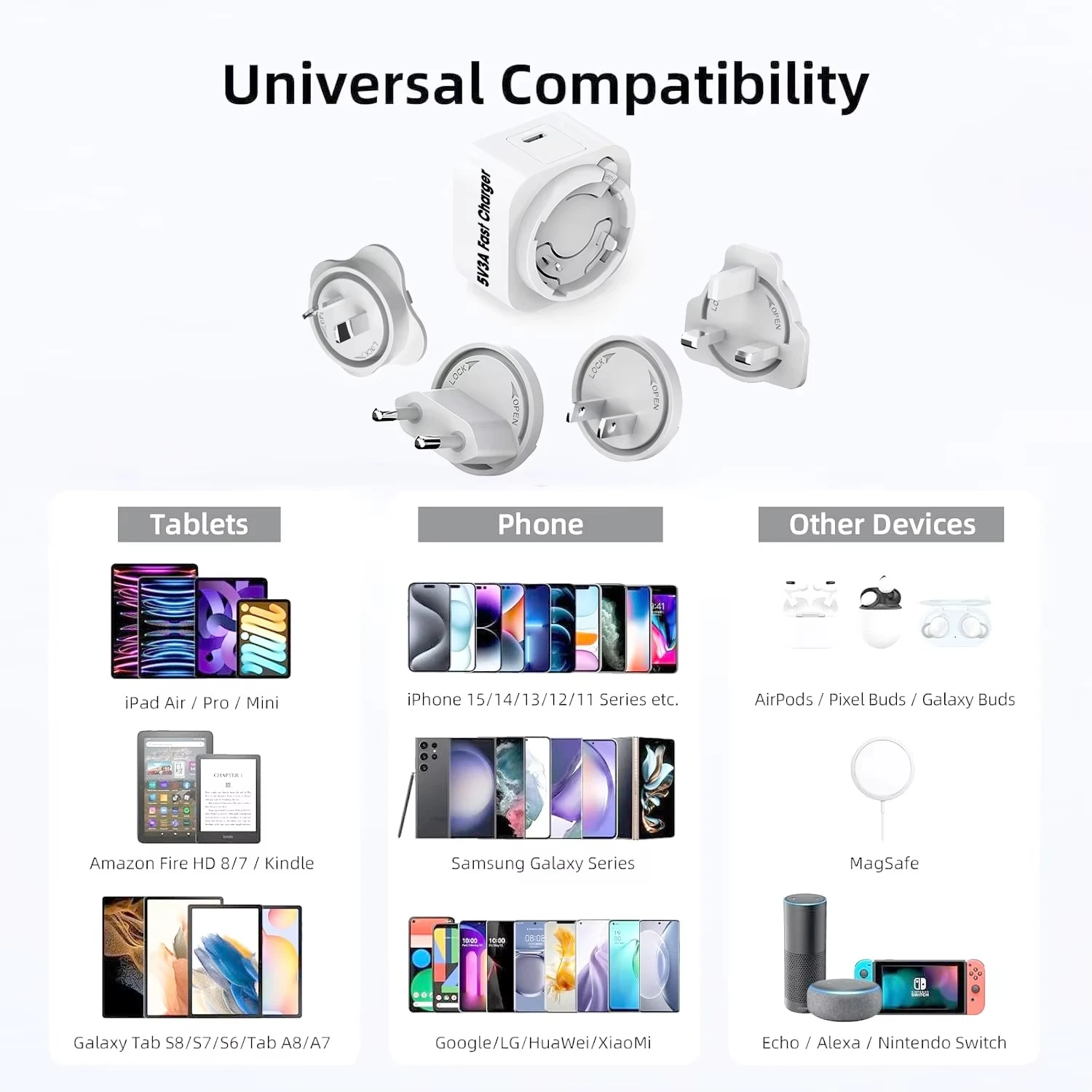 Vysoce kvalitní napájecí adaptér 5V 3A s výměnnými AC zástrčkami vyrobený společností Starwell poskytuje výstupní výkon 15 W pro rychlejší a bezpečnější globální nabíjení. Na tento produkt máme komplexní mezinárodní certifikaci a poskytujeme dvouletou záruku. Neváhejte nás kontaktovat. Výstup 5V/3A poskytuje optimální rychlost nabíjení pro smartphony, tablety, Bluetooth reproduktory a většinu zařízení napájených přes USB, což výrazně zkracuje dobu nabíjení ve srovnání se standardními adaptéry.