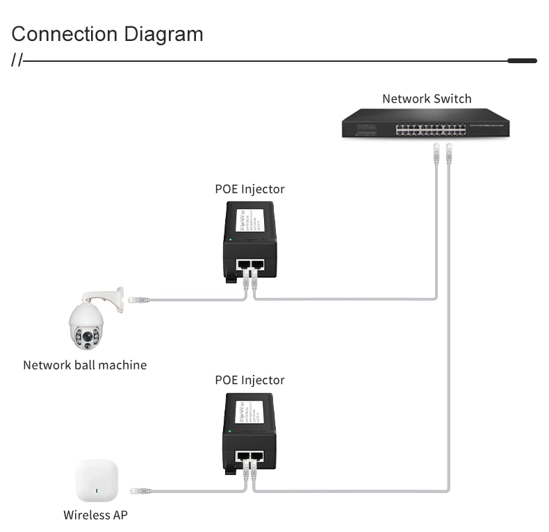 Flexibilní aplikace: 60W gigabitový aktivní PoE splitter IEEE802.3af Rychlost 1000 Mb/s pro IP kameru Bezdrátový přístupový bod lze spárovat s gigabitovým PoE splitterem pro napájení nestandardních zařízení, čímž se rozšiřuje jeho řada aplikačních scénářů.