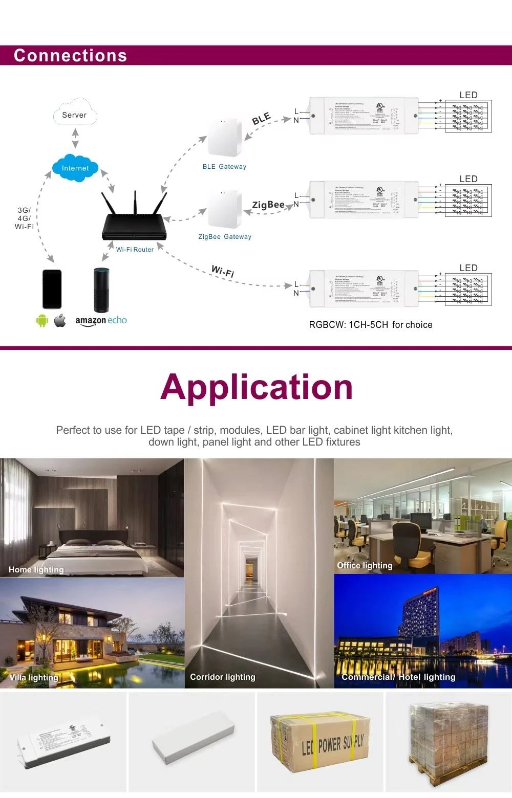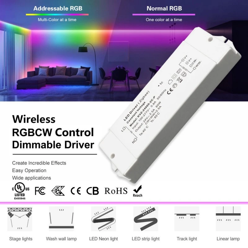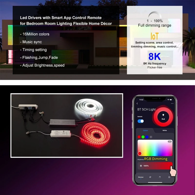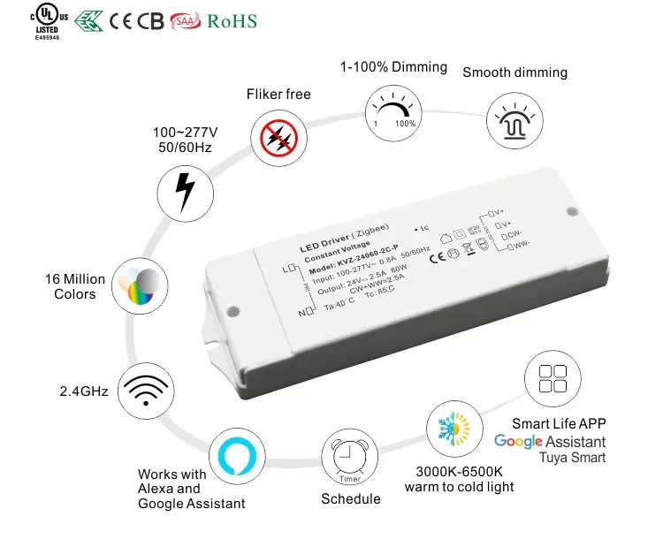 Chytré stmívání na dosah ruky Tento ovladač s integrovaným bezdrátovým modulem ZigBee s technologií TUYA nabízí bezproblémové chytré ovládání. Upravte jas pomocí mobilní aplikace nebo hlasových příkazů prostřednictvím Google Home a Amazon Echo. Vysokofrekvenční 8K Hz PWM výstup zajišťuje stmívání zcela bez blikání, zatímco rozsah stmívání 1–100 % s hloubkou 1 % umožňuje plynulé přechody a dokonalé vytvoření atmosféry.