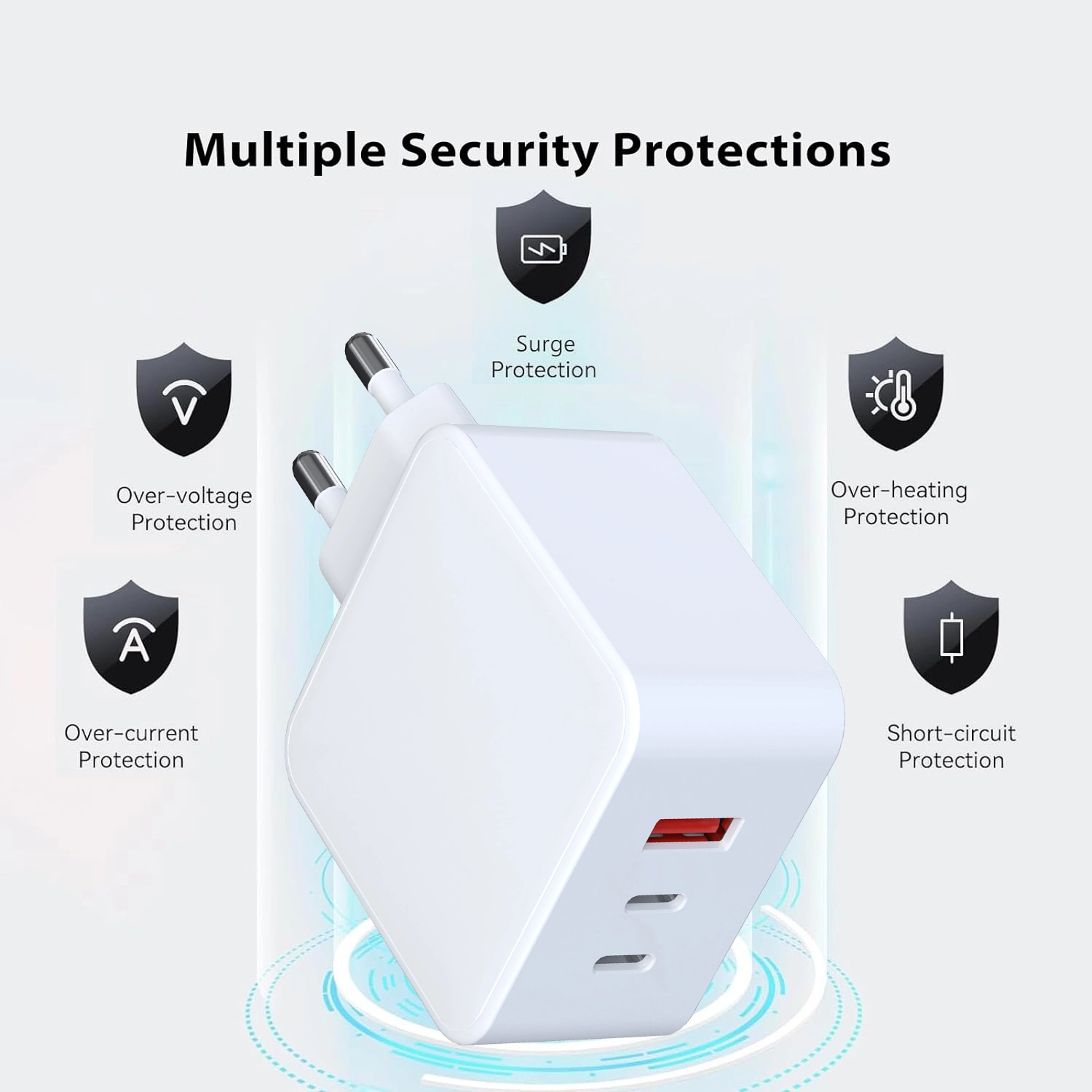 Inteligentní nabíjení s více porty - Vybaveno dvěma porty USB-C a USB-A, umožňuje nabíjet více zařízení současně bez ovlivnění rychlosti.