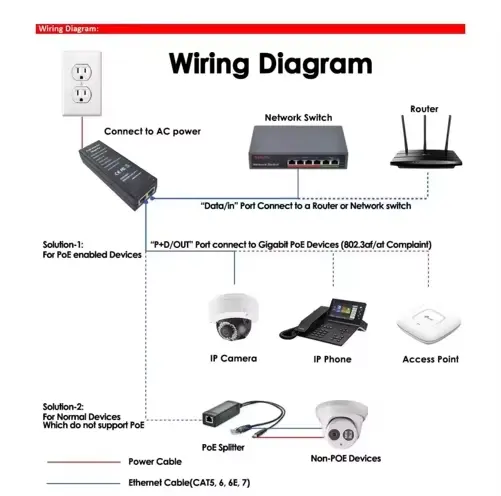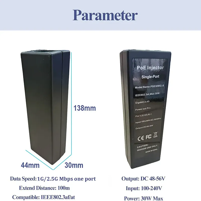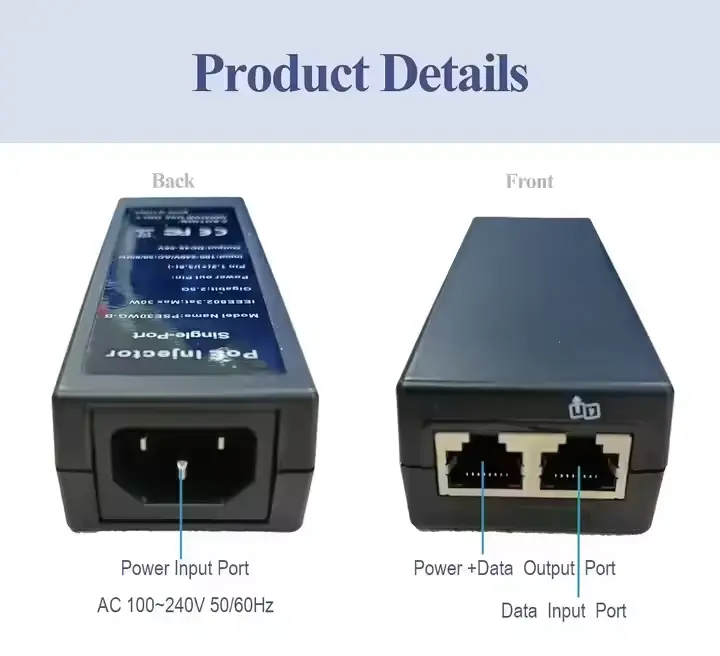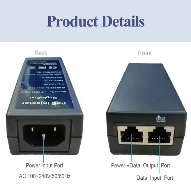 Jako profesionální výrobce napájecích zdrojů v Číně Starwell představuje svůj 802.3afat 48V 30W 1000Mbps Gigabit Ethernet PoE Injector. Toto zařízení podporuje automatické vyjednávání 10/100/1000 Mb/s/2,5G a obsahuje několik ochranných obvodů proti nadproudu, přepětí a zkratu. S rozsahem provozních teplot -20 °C až 50 °C je vhodný pro různá síťová zařízení, jako jsou IP kamery, bezdrátové AP a VoIP telefony. Produkt získal certifikace včetně CE, FCC a RoHS a je dodáván s 3letou zárukou.