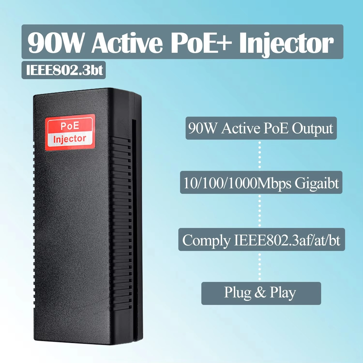 STARWELL OEM PoE Injector Gigabit 48V 90W PoE Injector pro IP kamery je vysoce výkonné Gigabit Power over Ethernet (PoE) řešení navržené pro malá až střední síťová prostředí. Je vybaven: