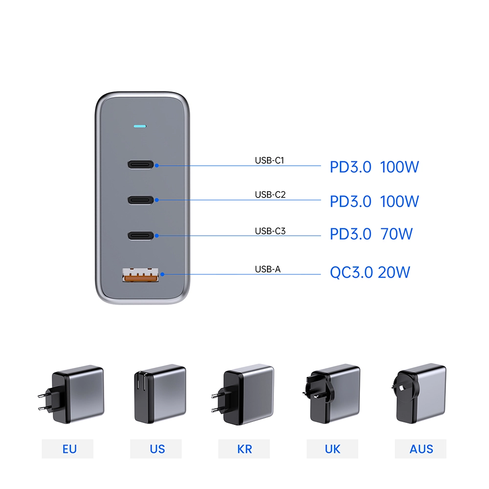 C1/C2 Výstup: 5V3A,9V3A,12V3A,15V3A,20V5A,PPS:3,3-20V5A (100W max) Výstup C3: 5V3A,9V3A,12V3A,15V3A,20V3,5A, (70W Max) PPS:3,3-11V5A USB-A výstup: 5V3A, 9V2A,12V1,67A,SCP:3,3-11V2A (22W Max) C1+C2/C1+C3 Výkon: 70W+30W C1+C2+(C3+USB-A) Výstup: 40W+40W+15W Celkem: 100W |