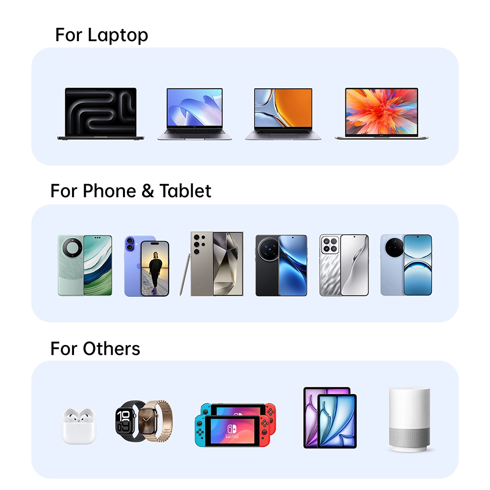 Výkon 100 W: Energetická stanice vašeho notebooku Porty USB-C1 a C2 ve svém jádru podporují špičkový výkon až 100 W. Tato výkonná přenosová kapacita je dostatečná pro splnění požadavků na rychlé nabíjení většiny notebooků. Ať už používáte MacBook Pro nebo jiné vysoce výkonné ultrabooky, jejich nabíjecí výkon může být srovnatelný s původními nabíječkami, nebo dokonce rychlejší. Zůstaňte energičtí, zaměřte se na tvorbu a produktivitu a při používání zařízení se nestarejte o výdrž baterie.