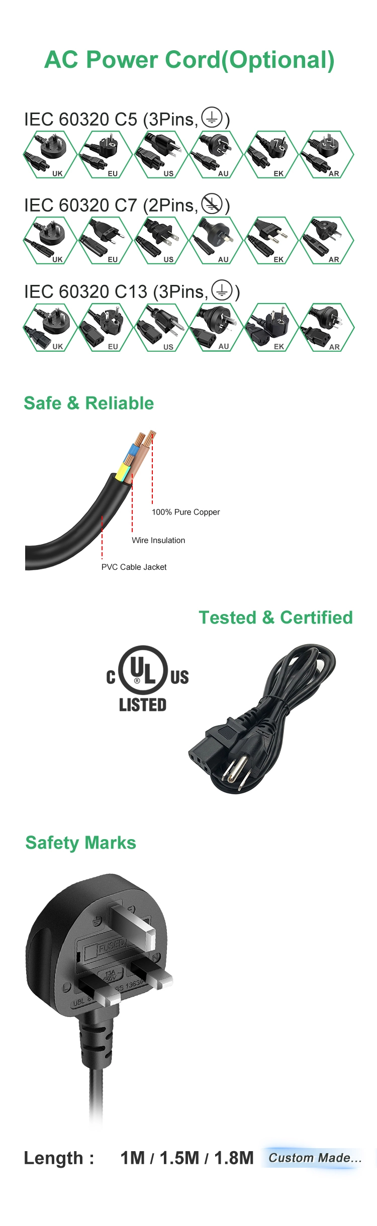 * K dispozici více jednotek pro 200W sérii: 5V/8V/9V/12V/13,5V/15V/18V/19V/24V/25V/30V/36V/29V/30V/42V/48V * Bezpečnost: OCP/OVP/OTP, SCP, automatické vypnutí při přetížení, vypnutí při přepětí, automatické tepelné vypnutí. * Široká kompatibilita: LED pásková světla, 3D tiskárna, radioamatér, CCTV kamery, subwoofer do auta, audio zesilovač, bezdrátový router, ADSL Cats, zvlhčovač, HUB, klávesnice, BT reproduktor, monitor, webkamera, DVR, NVR, audio/video napájecí zdroj