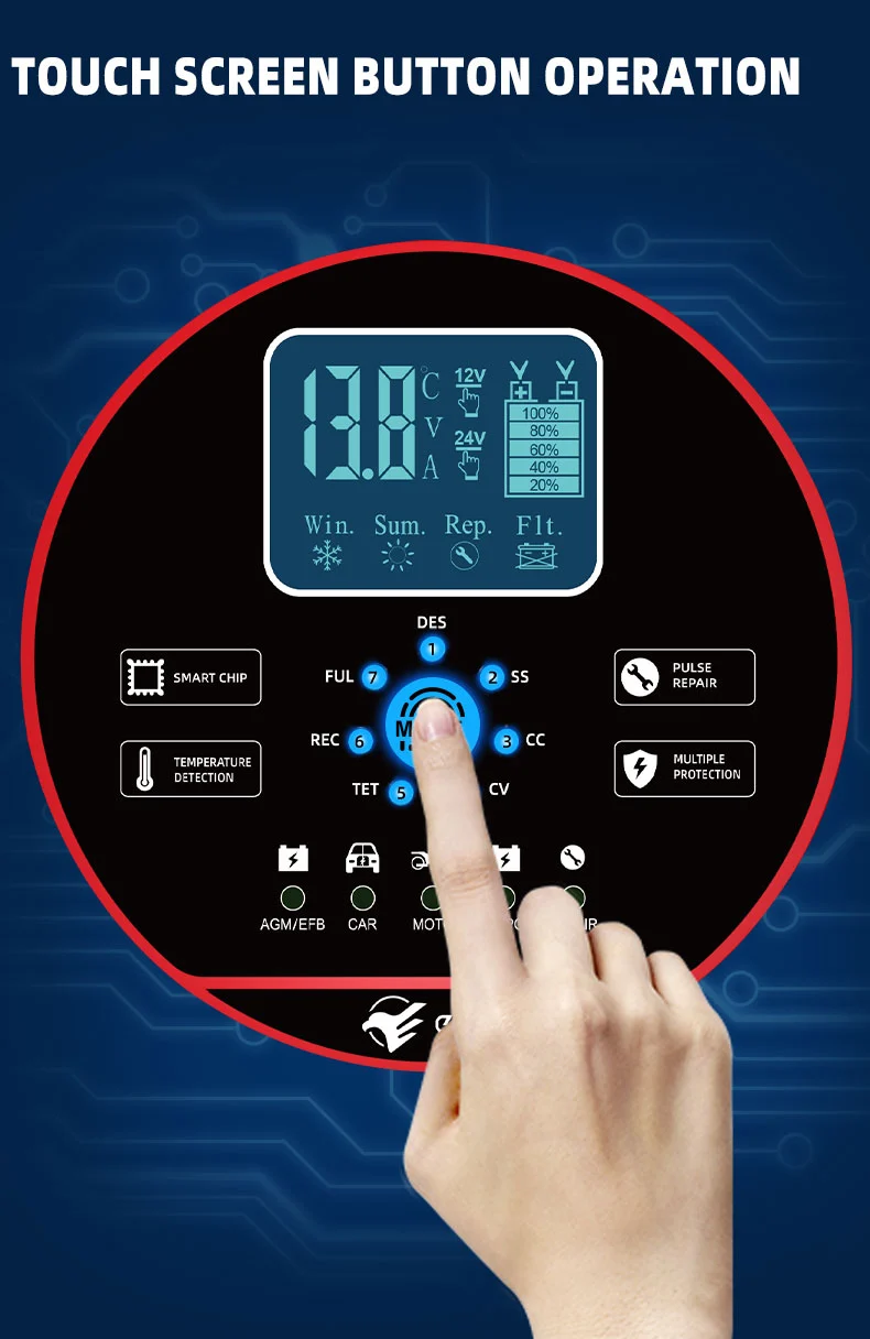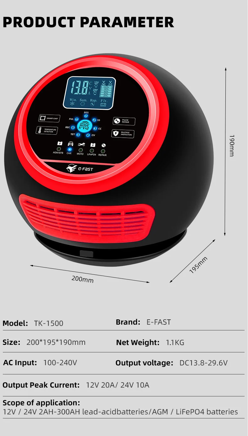 Tato nabíječka se vyznačuje inovativním kompaktním designem a je vybavena LCD displejem s vysokým rozlišením, který zobrazuje napětí, proud, teplotu, průběh nabíjení a stav baterie v reálném čase, takže obsluha je na první pohled jasná. Má vestavěnou funkci pulzní opravy, která dokáže aktivovat a opravit staré baterie a prodloužit jejich životnost. Jako plně automatická inteligentní nabíječka podporuje TK-1500 provoz „zapoj a zapomeň“: automaticky detekuje napětí baterie, zvolí režim nabíjení a po plném nabití se přepne do udržovacího režimu nabíjení, aby se zabránilo přebíjení. Je ideální pro údržbu baterií vozidel, která jsou zaparkována na dlouhou dobu, nebo sezónního vybavení, jako jsou sekačky na trávu a lodě.