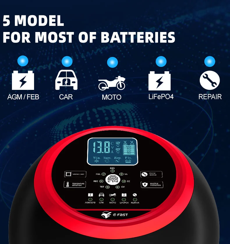 Jako profesionální výrobce v Číně by vám společnost Starwell ráda poskytla kvalitní inteligentní nabíječku baterií TK-1500, která je vybavena několika bezpečnostními ochrannými funkcemi, jako je ochrana proti přepětí, nadproudová ochrana, ochrana proti zkratu, ochrana proti zpětnému připojení a ochrana proti přehřátí, což zajišťuje bezpečný a spolehlivý proces nabíjení. Podporuje také udržovací režim plovoucího nabíjení, který je vhodný pro údržbu baterie vozidel, která jsou delší dobu zaparkovaná. S krytím IP65 (příkladová hodnota, lze upravit podle skutečných podmínek) zvládne vlhké a prašné prostředí na lodích nebo venku. Ať už se jedná o každodenní nabíjení autobaterií nebo doplňování energie pro baterie sekačky na trávu nebo rybářské čluny, TK-1500 může poskytnout efektivní, stabilní a inteligentní nabíjení, díky čemuž je ideální volbou jak pro profesionální uživatele, tak pro kutily.