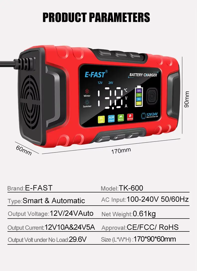 Vysoce kvalitní plně automatická E-Fast TK-600 s technologií Pulse Repair Technology 12V10A 24V5A olověná baterie lifepo4 nabíječka do auta |